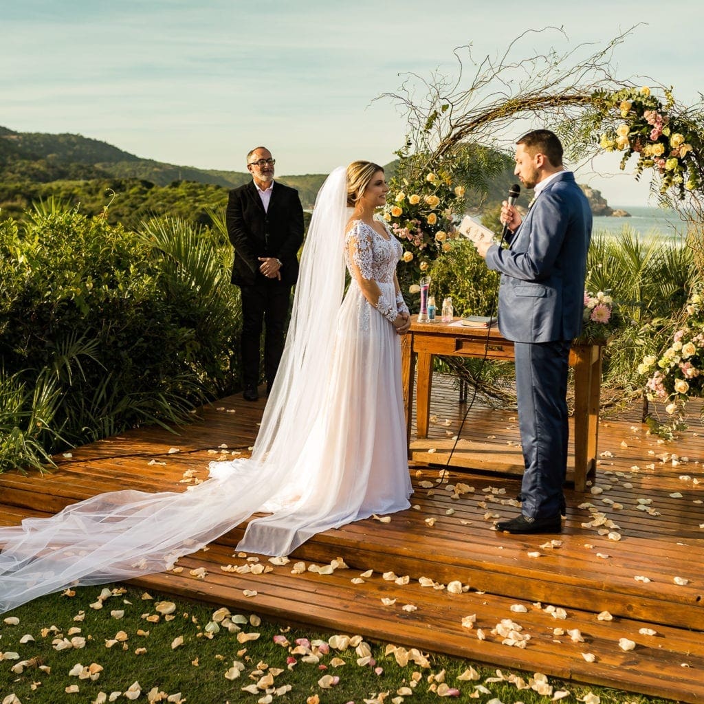 Todas as estações tem a sua beleza aqui na Praia do Rosa. Classicamente as pessoas associam praia a verão e calor, mas como sempre digo Casamento é mais que um banho de sol. O verão é tempo de férias escolares, não considero a melhor época para casamentos, pela alta densidade de turistas na região, o que dificulta enormemente a logística da festa principalmente em relação a fornecedores e convidados. Tirando os meses de verão (janeiro e fevereiro), todos os outros tem a sua beleza, e a apresentam a grande vantagem da praia, hóteis, pousadas, restaurantes, estradas e aeroportos estarem com fluxo normal e desimpedidos, facilitando a movimentação e logística de todos os convidados e fornecedores envolvidos no seu grande dia.